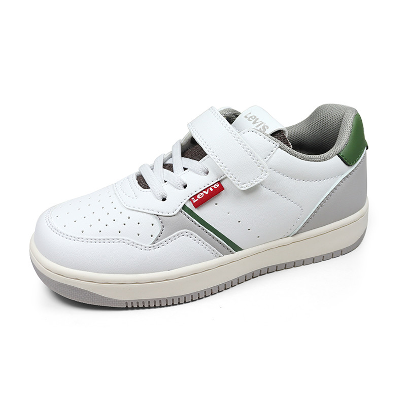 Παιδικό sneaker Levi’s σε λευκό χρώμα με πράσινες και γκρι λεπτομέρειες και το λογότυπο της εταιρίας στο πλάι και το πίσω μέρος. Με υφασμάτινη επένδυση εσωτερικά, ελαστικά κορδόνια, velcro για εύκολη εφαρμογή και σόλα με contrast λεπτομέρεια.