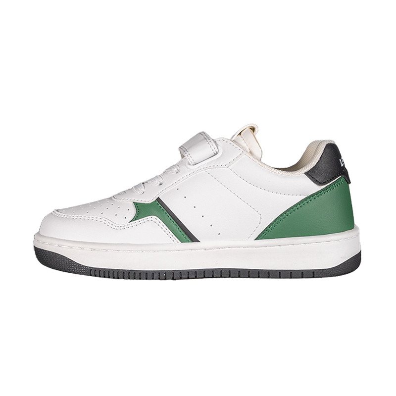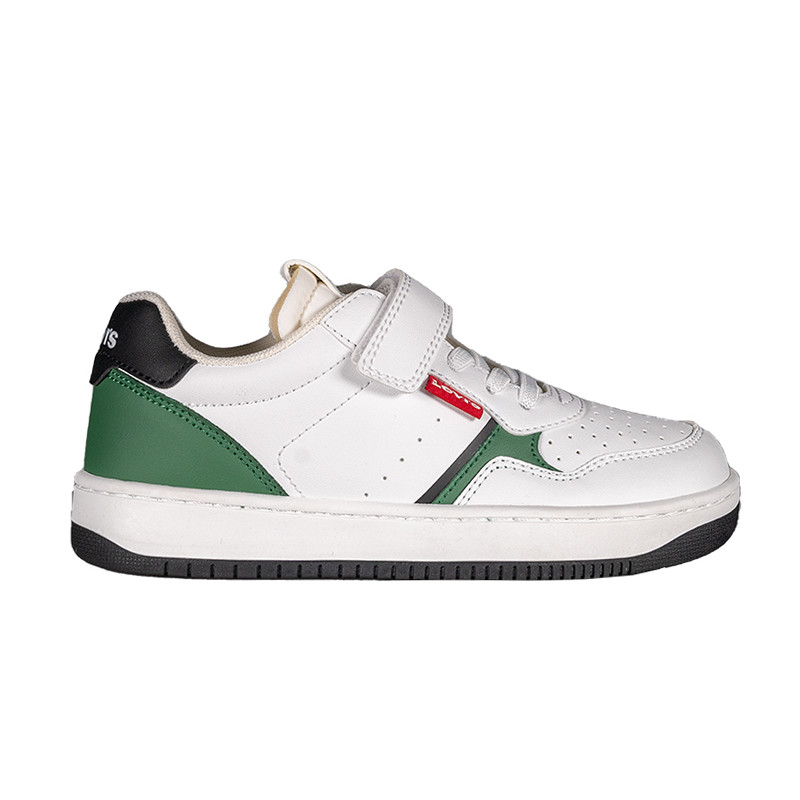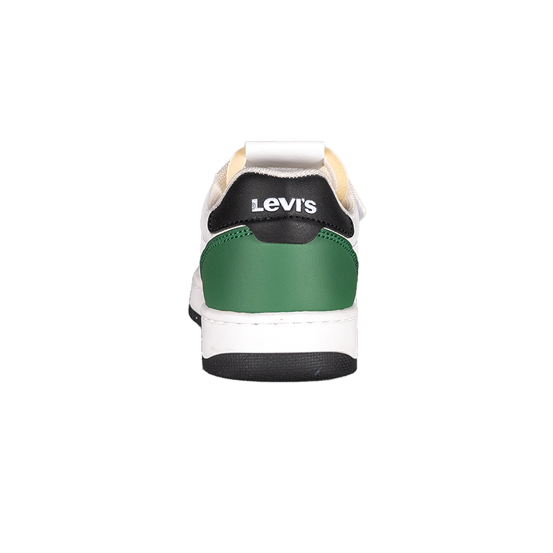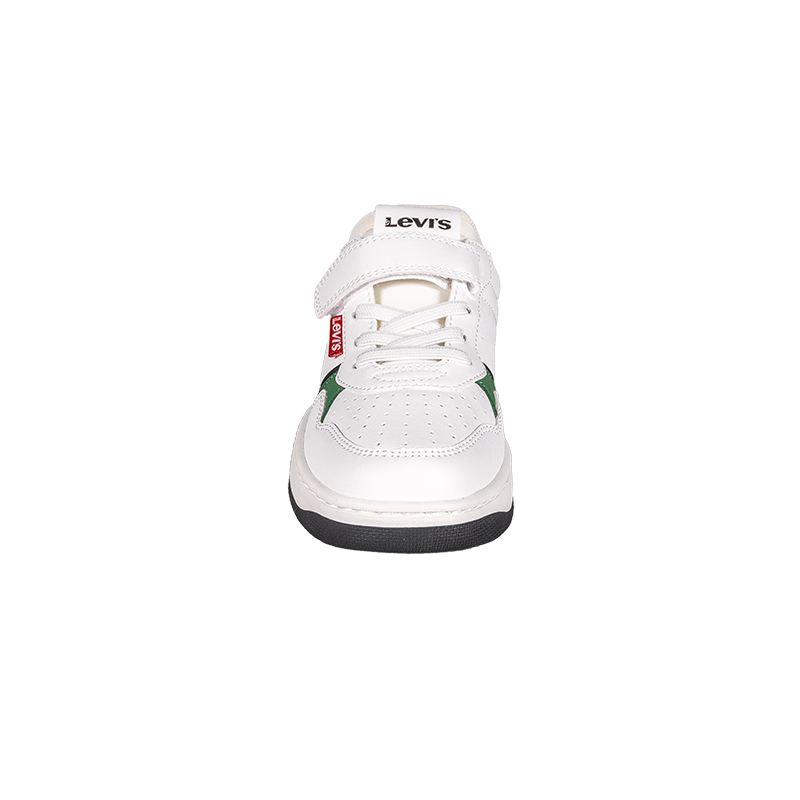 Παιδικό sneaker Levi’s σε λευκό χρώμα με πράσινες και μαύρες λεπτομέρειες και το λογότυπο της εταιρίας στο πλάι και το πίσω μέρος. Με υφασμάτινη επένδυση εσωτερικά, ελαστικά κορδόνια, velcro για εύκολη εφαρμογή και σόλα με λεπτομέρεια contrast.