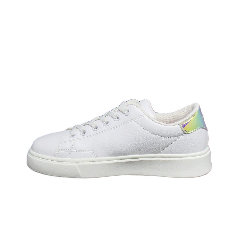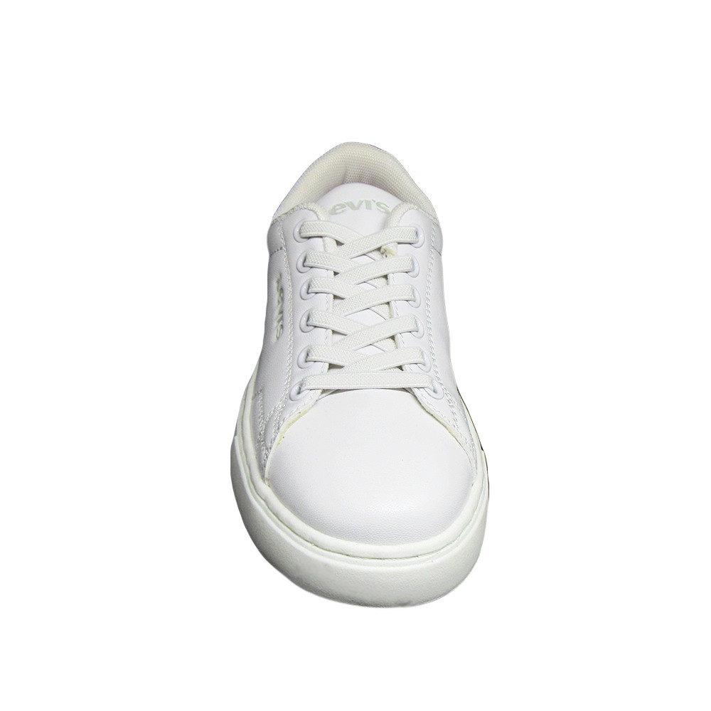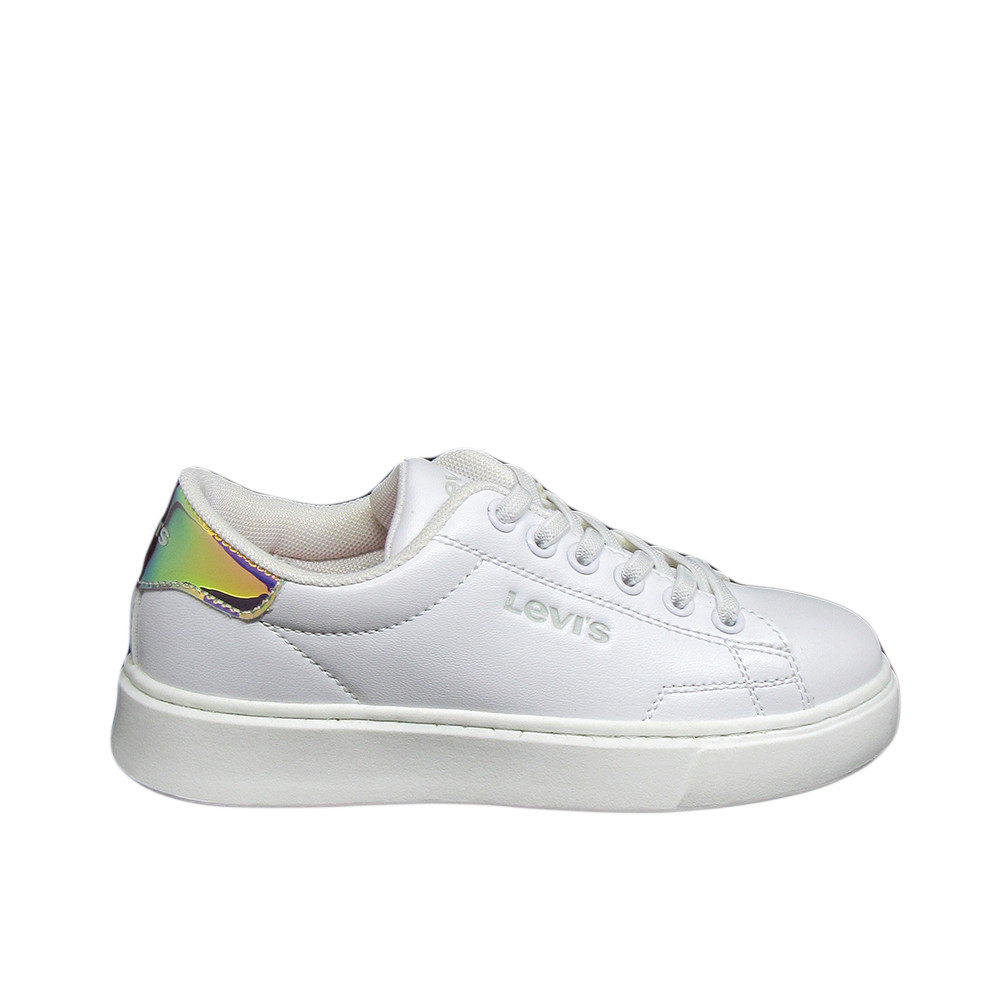 Παιδικό sneaker Levi’s σε λευκό χρώμα με εφέ καθρέφτη και το λογότυπο της εταιρίας στο πλάι και το πίσω μέρος. Διαθέτει υφασμάτινη επένδυση εσωτερικά και υφασμάτινα κορδόνια.