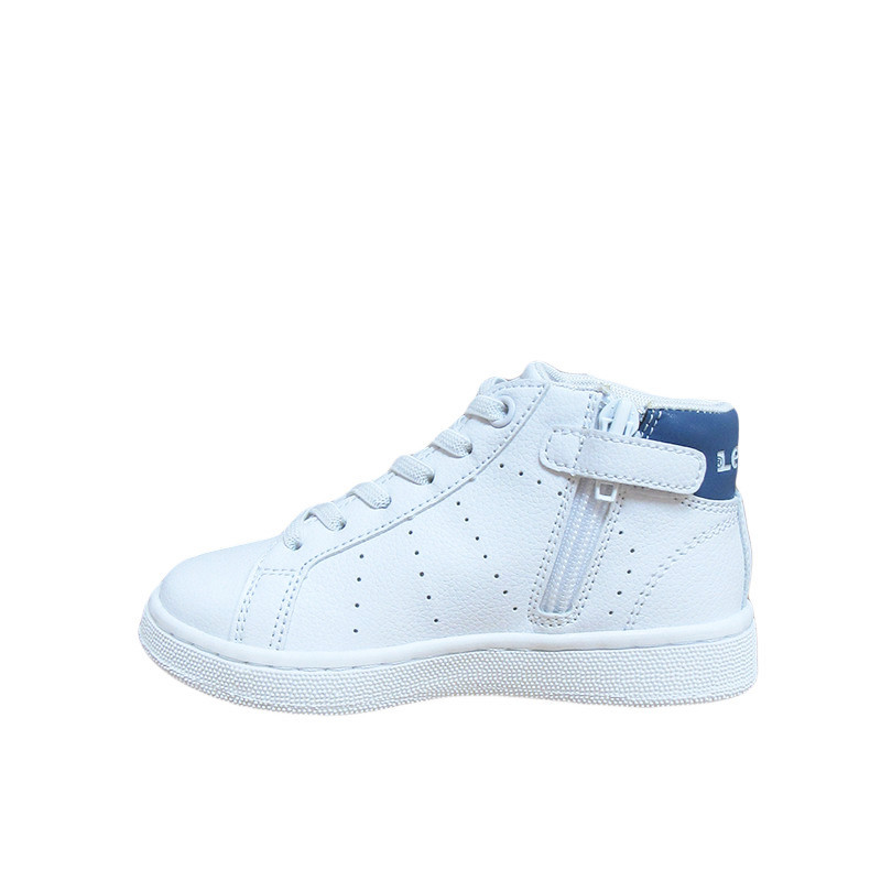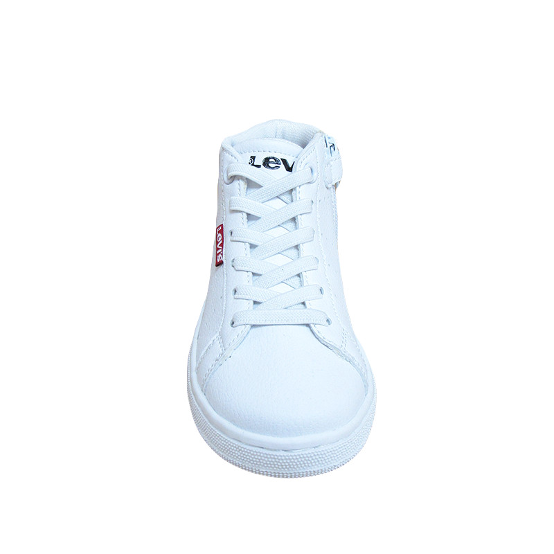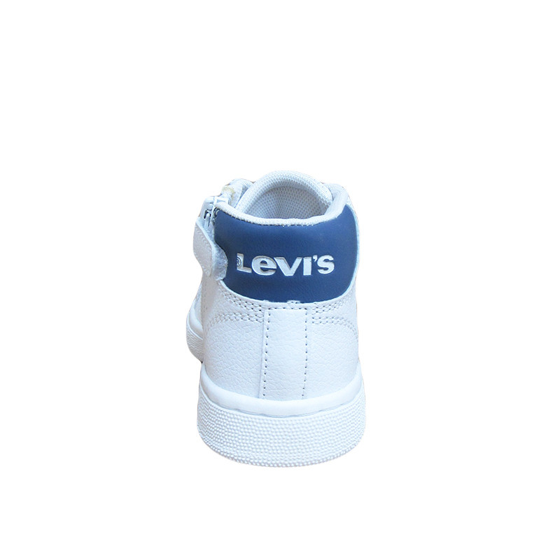 Παιδικό μποτάκι Levi’s σε λευκό χρώμα με μπλε λεπτομέρεια και το λογότυπο της εταιρίας στο πίσω μέρος. Διαθέτει ελαστικά κορδόνια, φερμουάρ στο πλάι και velcro για εύκολη εφαρμογή.