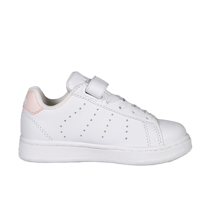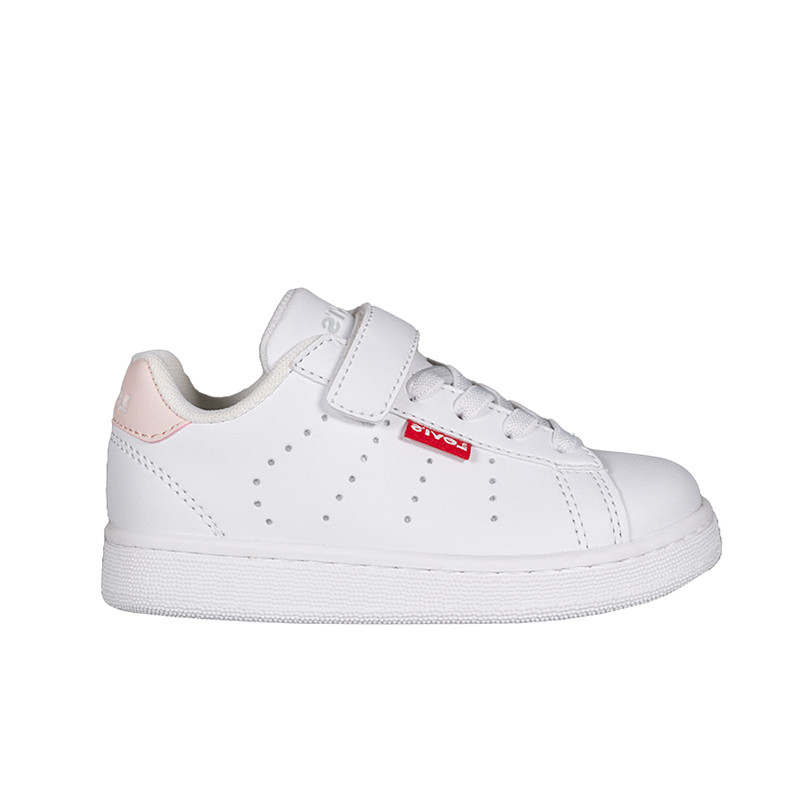 Παιδικό sneaker Levi’s σε λευκό χρώμα με ροζ λεπτομέρεια και το λογότυπο της εταιρίας στο πλάι και το πίσω μέρος. Έχει κανονική φόρμα και δεν καλύπτει τον αστράγαλο, αφήνοντας την κίνηση του ποδιού ανεμπόδιστη. Διαθέτει υφασμάτινη επένδυση εσωτερικά, ελαστικά κορδόνια και velcro για εύκολη εφαρμογή.