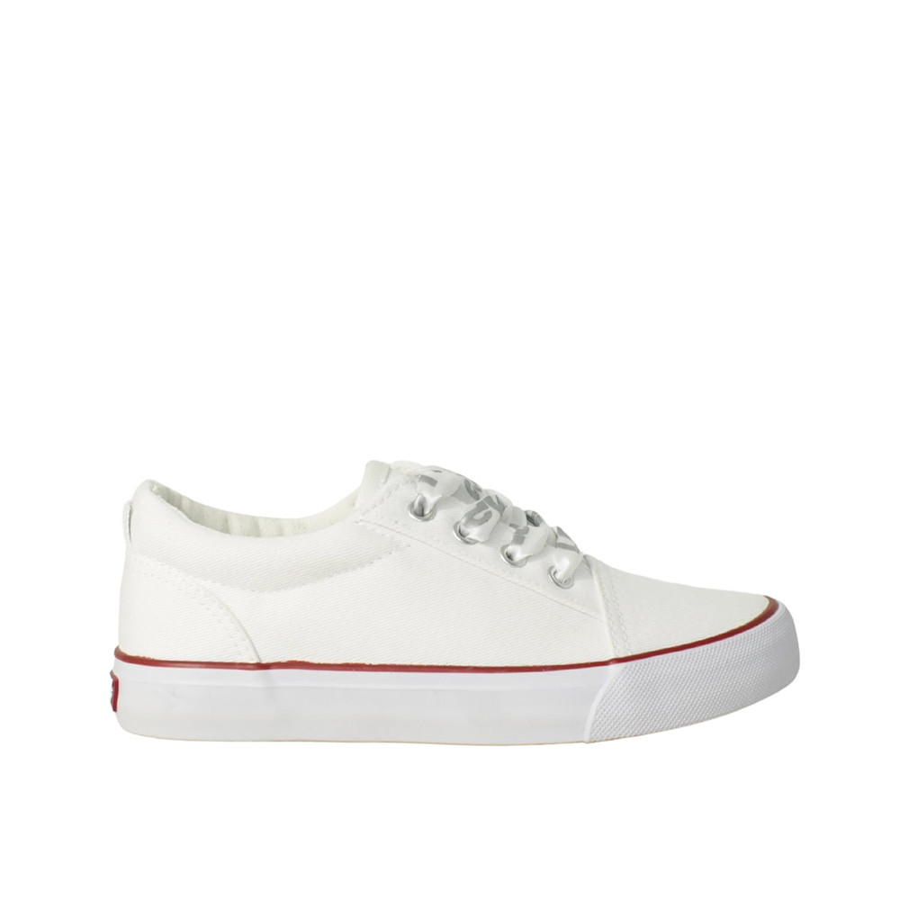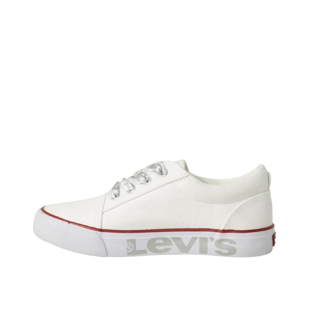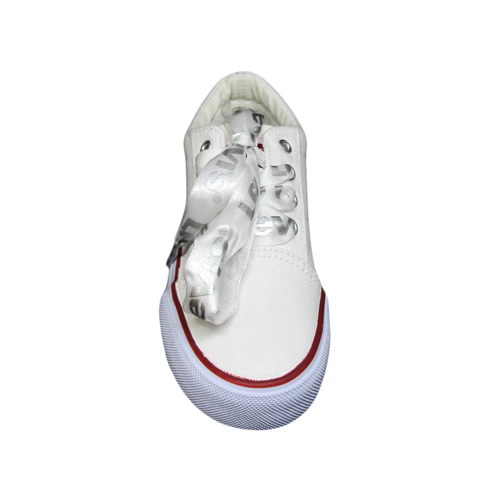 Παιδικό πάνινο παπούτσι Levi’s σε άσπρο χρώμα με το λογότυπο της εταιρίας τυπωμένο στη σόλα. Διαθέτει σατέν κορδόνια και υφασμάτινη επένδυση εσωτερικά.