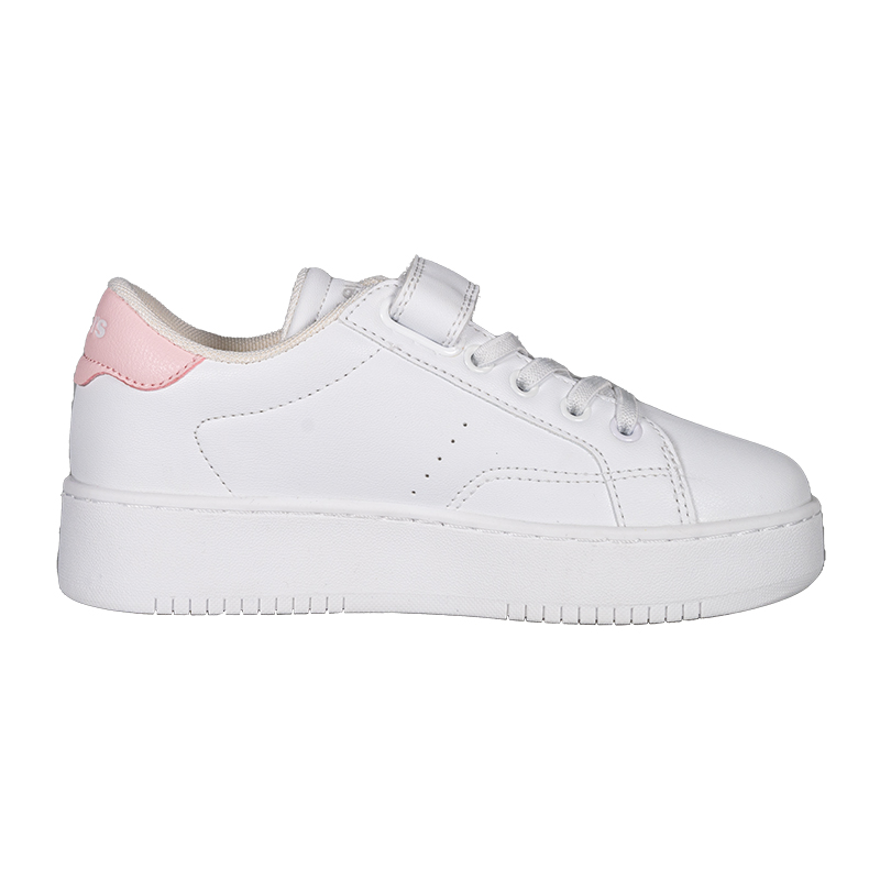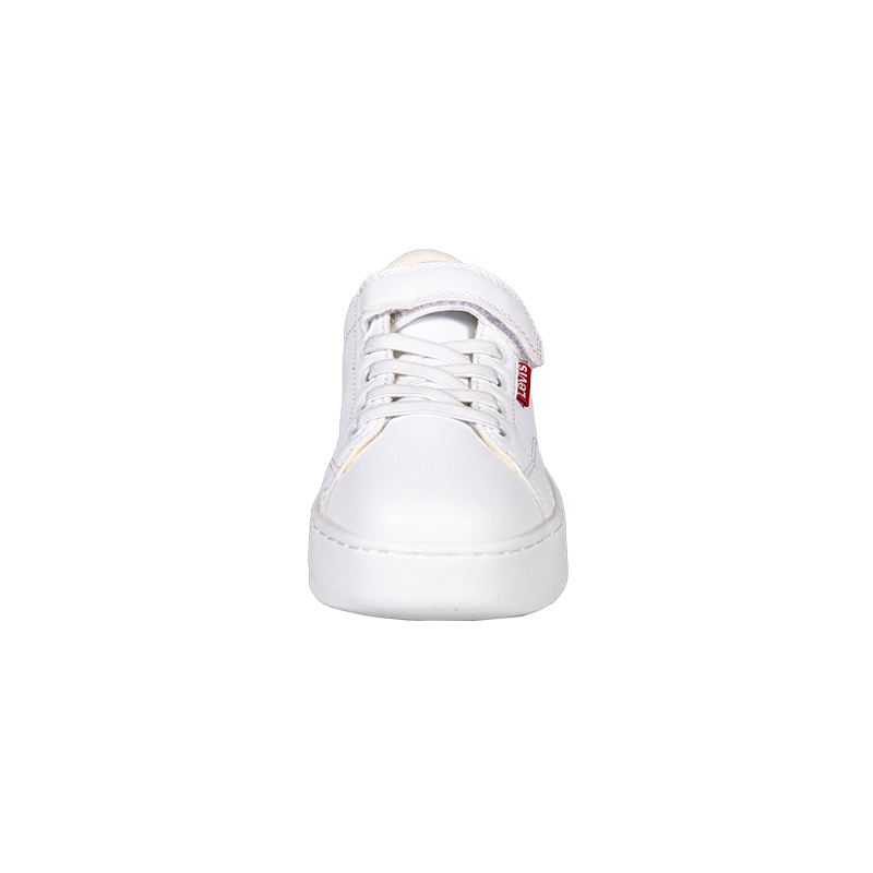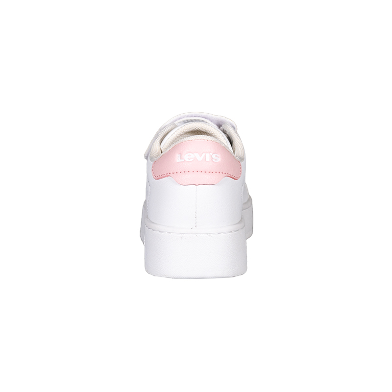 Παιδικό sneaker Levi’s σε λευκό χρώμα με ροζ λεπτομέρεια και το λογότυπο της εταιρίας στο πλάι και το πίσω μέρος. Διαθέτει ελαστικά κορδόνια και velcro για εύκολη εφαρμογή.