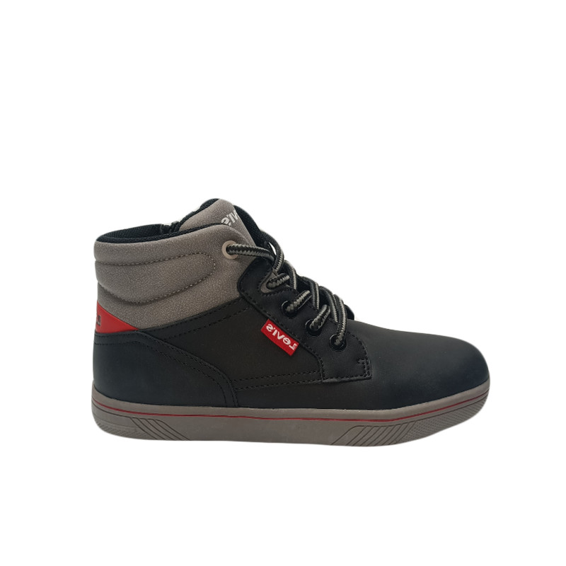 Παιδικό μποτάκι Levi’s σε μαύρο χρώμα με γκρι λεπτομέρειες. Έχει υφασμάτινη επένδυση εσωτερικά και υφασμάτινα κορδόνια Διαθέτει φερμουάρ στο πλάι για εύκολη εφαρμογή.