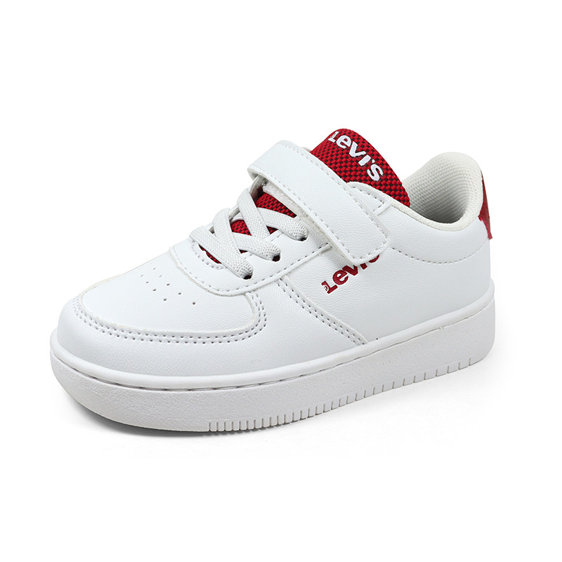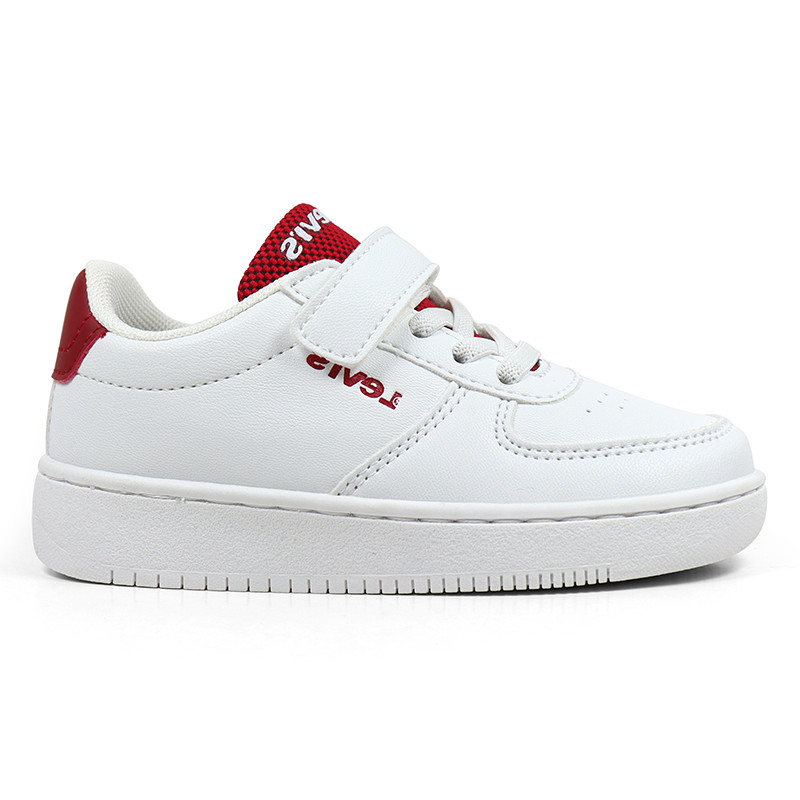 Παιδικό sneaker Levi’s σε λευκό χρώμα με κόκκινες λεπτομέρειες και το λογότυπο της εταιρίας στο πλάι και το μπροστά μέρος. Διαθέτει ελαστικά κορδόνια και velcro για εύκολη εφαρμογή.