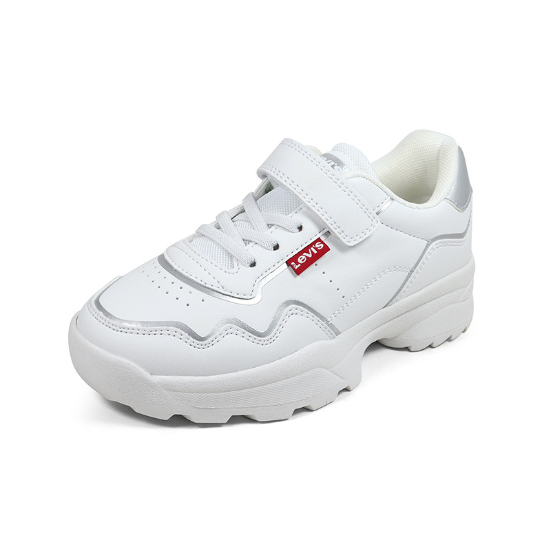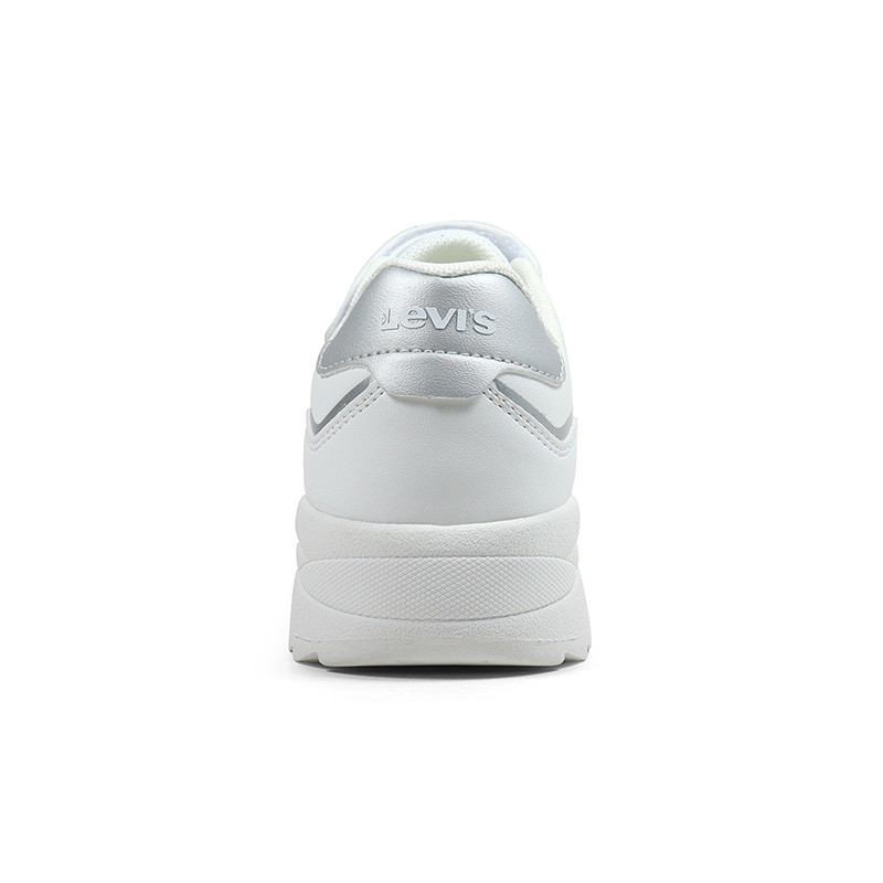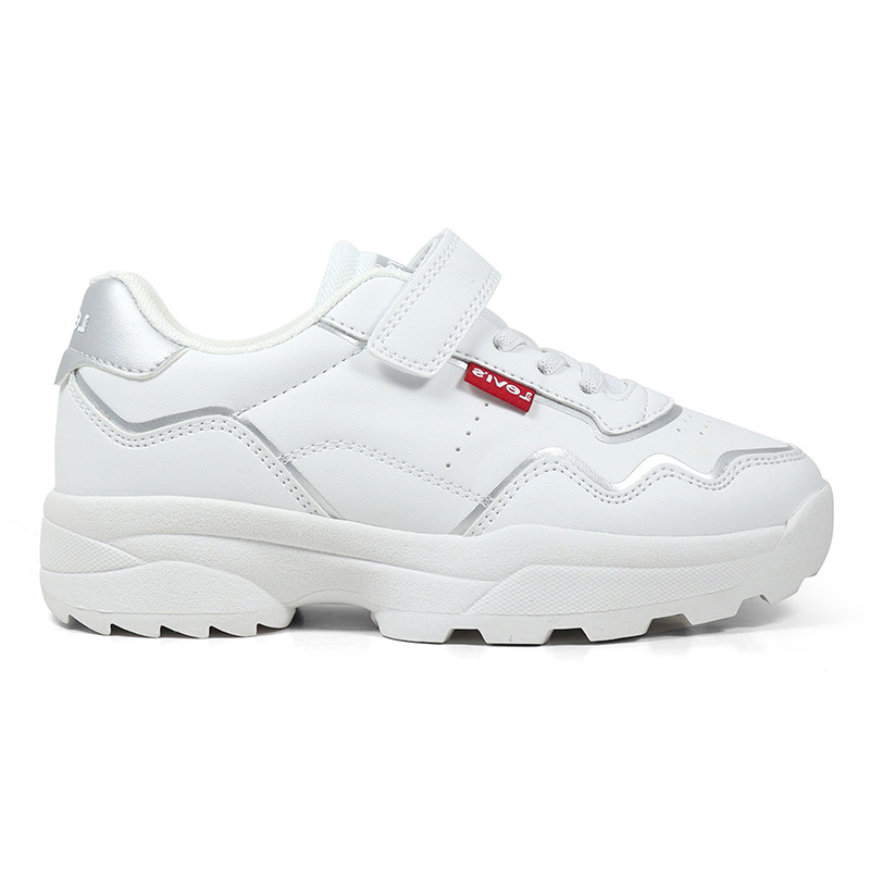 Παιδικό sneaker Levi’s σε λευκό χρώμα με ασημί λεπτομέρεια και το λογότυπο της εταιρίας στο πλάι και το πίσω μέρος. Διαθέτει υφασμάτινη επένδυση εσωτερικά, ελαστικά κορδόνια και velcro για εύκολη εφαρμογή.