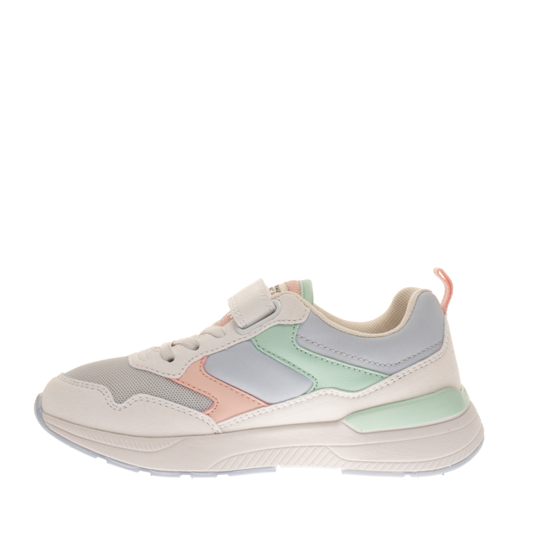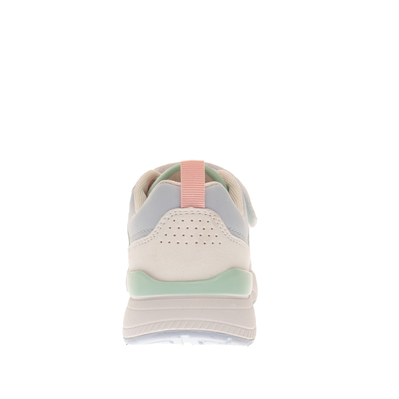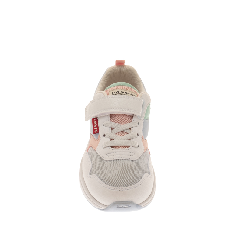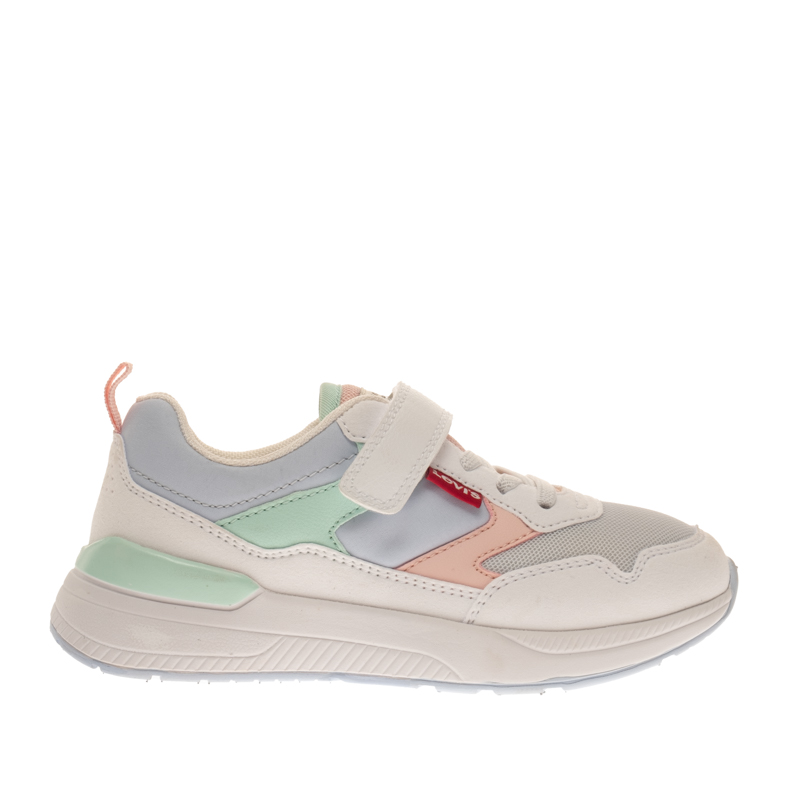 Παιδικό αθλητικό παπούτσι Levi’s σε λευκό χρώμα με παστέλ λεπτομέρειες. Με υφασμάτινη επένδυση εσωτερικά και ελαφριά αντιολισθητική σόλα. Διαθέτει ελαστικά κορδόνια και velcro για εύκολη εφαρμογή.