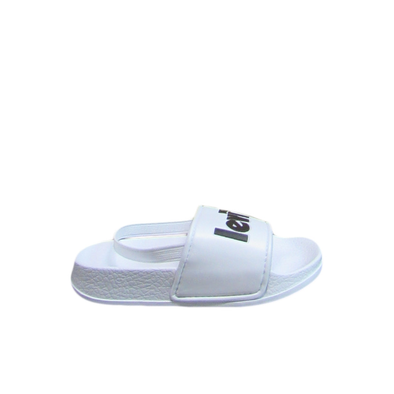 Παιδική σαγιονάρα Levi’s σε λευκό χρώμα με το λογότυπο της εταιρίας στο μπροστινό μέρος. Διαθέτει slip-on εφαρμογή και λάστιχο για να κρατάει σταθερό το πόδι και χαρίζει άνετο περπάτημα με το ανατομικό της σχήμα.