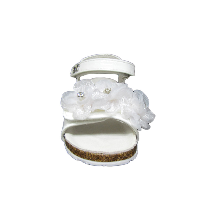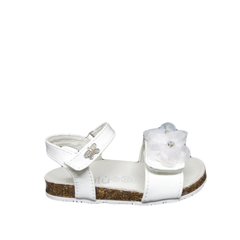 Παιδικό πέδιλο Lulu σε άσπρο χρώμα με λουλούδια στο μπροστινό μέρος. Διαθέτει διπλό velcro για εύκολη εφαρμογή.