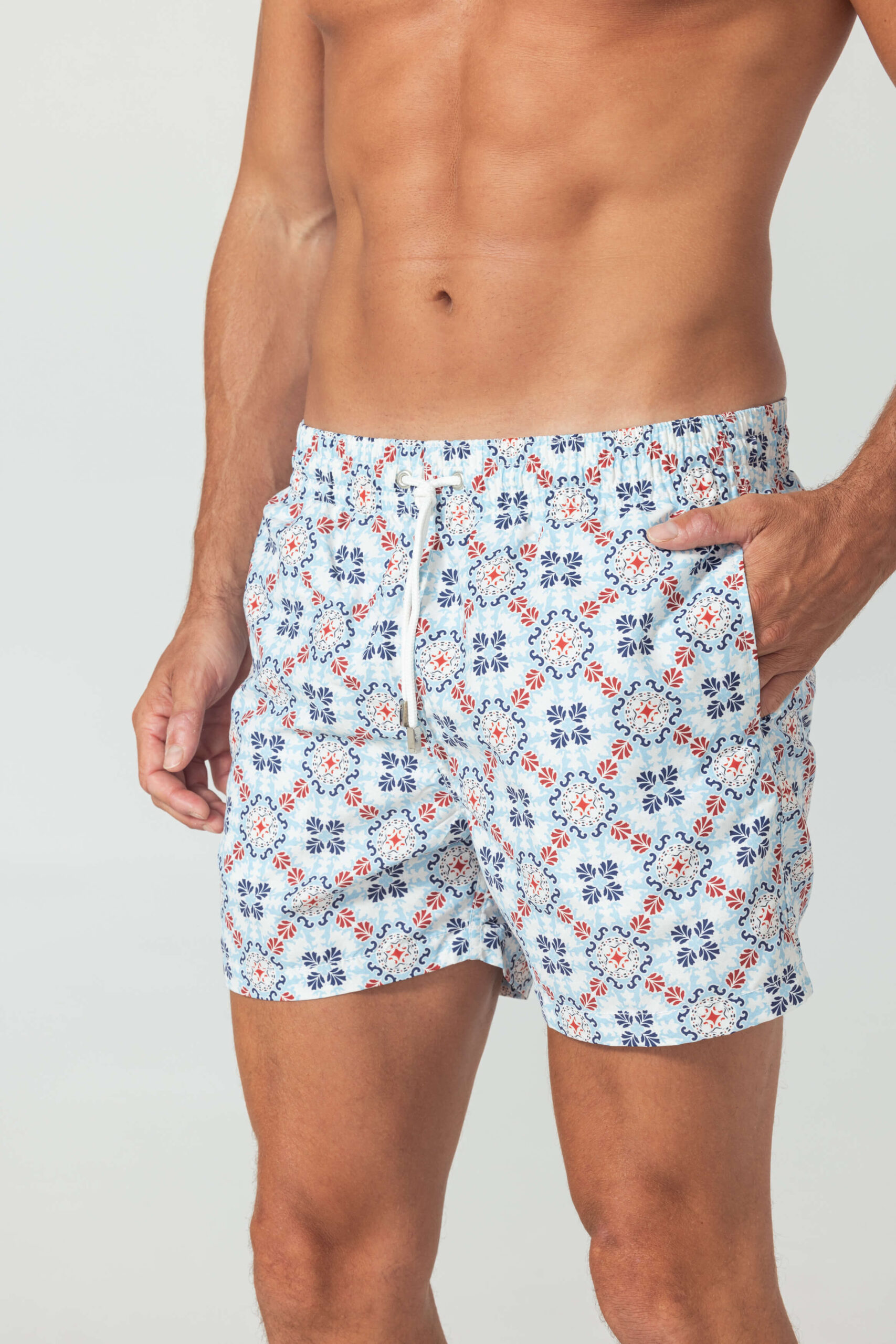 Ανδρικό μαγιό Rivea με γαλάζιο σχέδιο και το λογότυπο της εταιρίας στο πίσω μέρος. Κατασκευασμένο από ελαφρύ και γρήγορο στο στέγνωμα ύφασμα, εξασφαλίζει άνετη εφαρμογή όλη μέρα. Η ελαστική μέση με ρυθμιζόμενο κορδόνι προσφέρει τέλεια προσαρμογή.