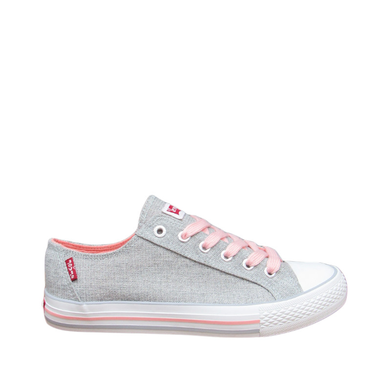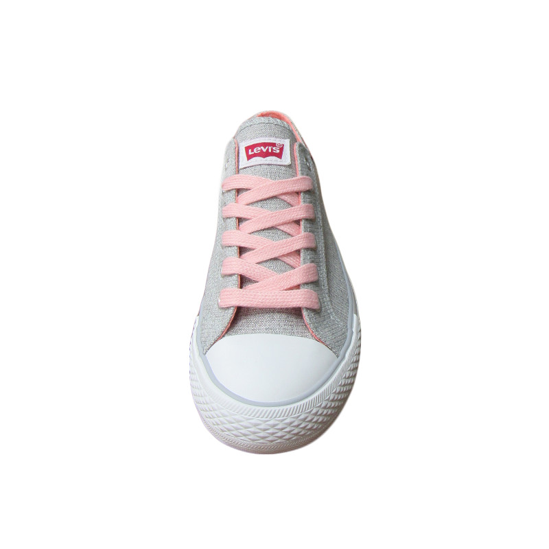 Παιδικό πάνινο παπούτσι Levi’s σε γκρι χρώμα με το λογότυπο της εταιρίας. Διαθέτει υφασμάτινη επένδυση εσωτερικά και ροζ υφασμάτινα κορδόνια.