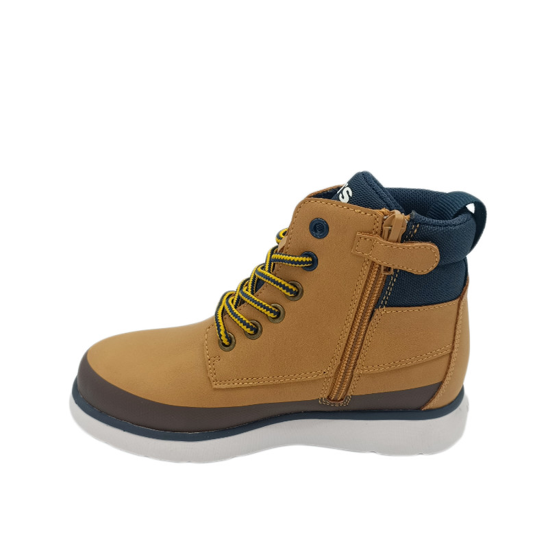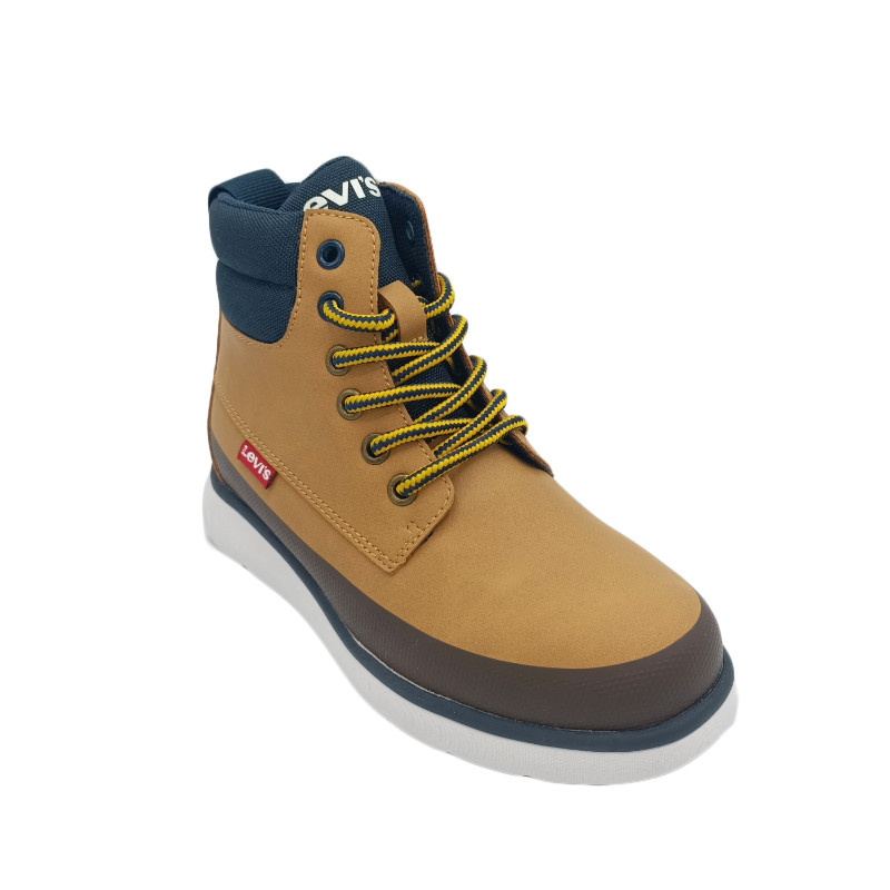 Παιδικό μποτάκι Levi’s σε κίτρινο χρώμα με καφέ και denim λεπτομέρεια. Διαθέτει υφασμάτινη επένδυση εσωτερικά και υφασμάτινα κορδόνια.