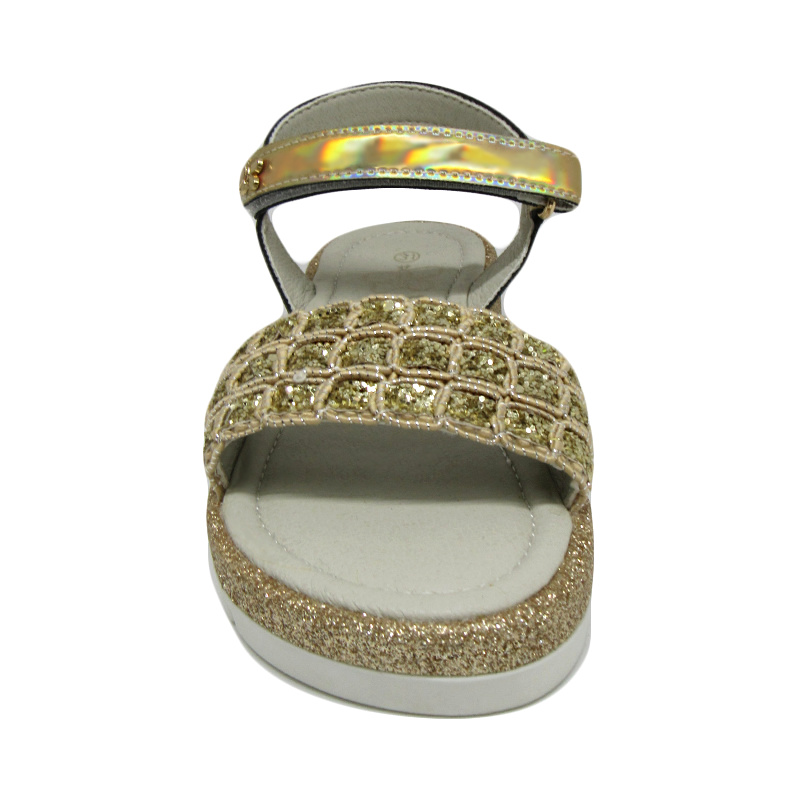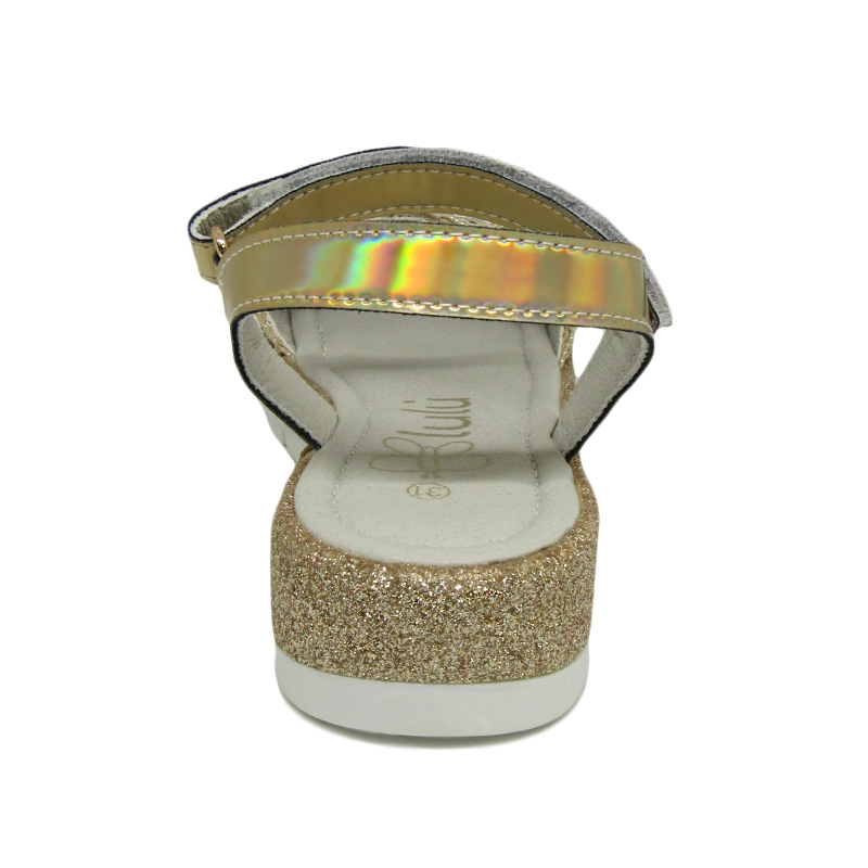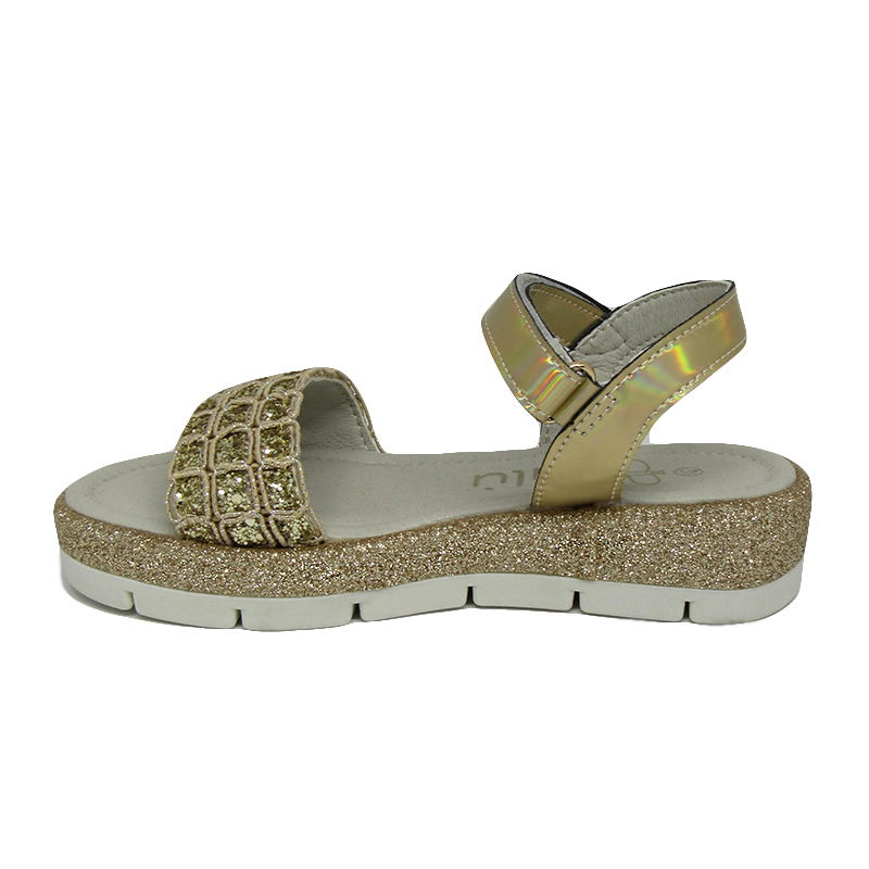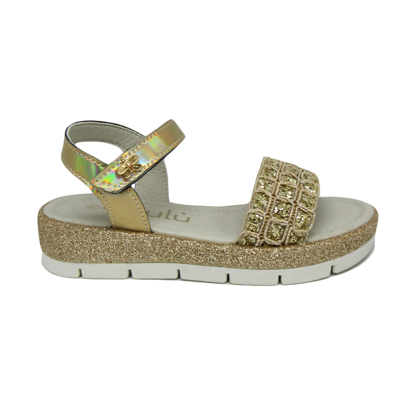 Παιδικό πέδιλο Lulu σε χρυσό χρώμα με σχέδιο. Διαθέτει velcro για εύκολη εφαρμογή.