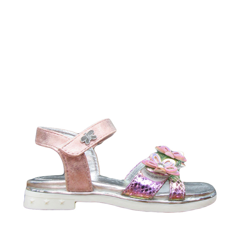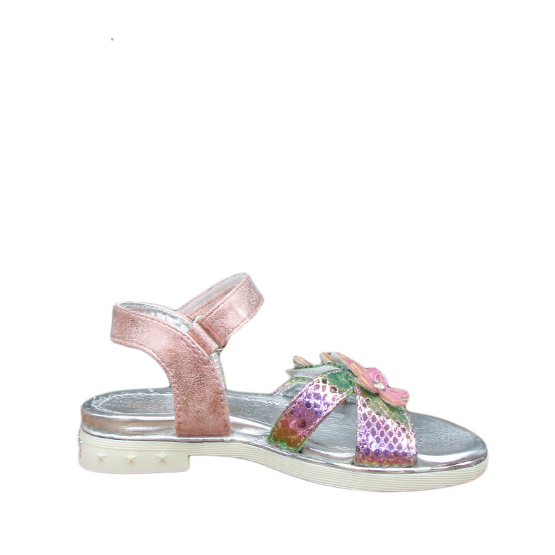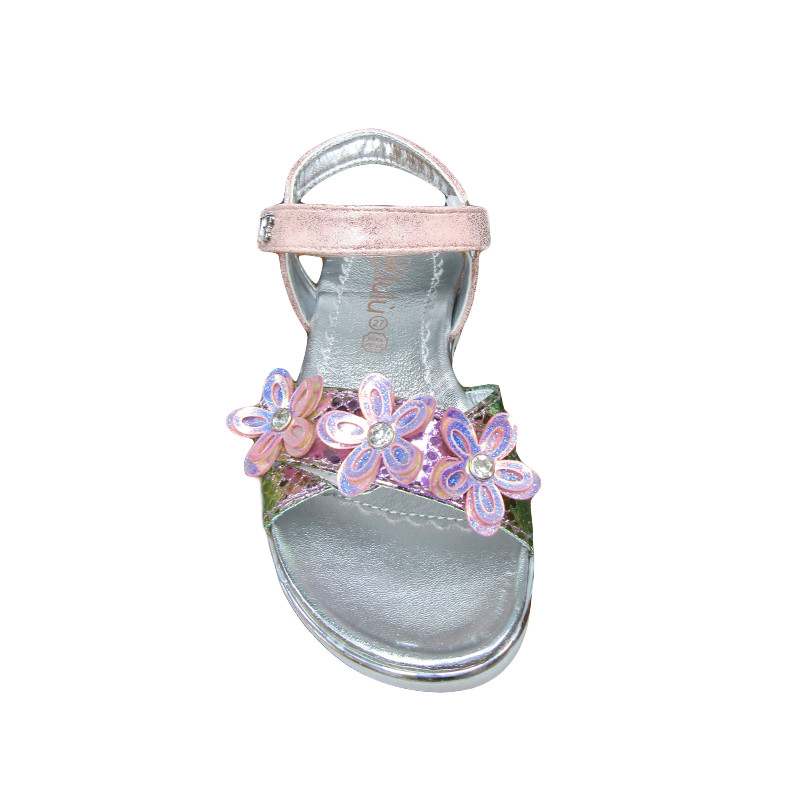 Παιδικό πέδιλο Lulu σε ροζ χρώμα με λεπτομέρειες λουλουδάκια. Διαθέτει δύο velcro για εύκολη εφαρμογή.